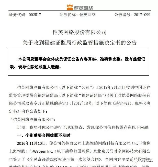 近来公司高层的集体身陷囹圄和证监会的立案调查,似乎也初步坐实了外界的怀疑。事实上,福建证监局早在2017年就对恺英网络采取过责令改正的监管措施,显示公司存在重要合同、会计政策变更、重大事项、对外理财投资未及时履行信息披露义务的情况。根据证券法和最高法司法解释,众维515证券索赔网吴立骏律师提示:2019年10月8日收盘仍持有恺英网络而遭受损失的投资者,可登录众维515官网报名加入诉前登记,在证监会对公司的处罚决定下达后发起民事索赔。最终索赔条件以证监会调查结论和法院认定为准,投资者在获赔前无须支付前期费用。