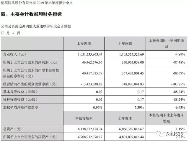 然而,近年来,由于游戏版号冻结和行业增速放缓,不少游戏公司面临业绩下滑的困境,恺英网络也不例外。业绩承诺期一过,恺英网络便上演了令投资者始料未及的“变脸”大戏。2018年,恺英网络实现营收22.84亿元,同比下降27.13%;营业利润和归母净利润同比最高降幅近90%。2019年上半年,公司预计实现归属于上市公司股东的净利润修正后为4500万元至6750万元,比上年同期下降82%-88%。而此前公司曾公告称,预计上半年净利润为1.1亿元至1.65亿元。上半年公司经营活动产生的现金流量净额为-1342.30万元,而上年同期为348,80万元,同比大降103.85%。不禁想腹黑一下:业绩弹性如此之大,是简单的“盈亏同源”还是另有隐情?