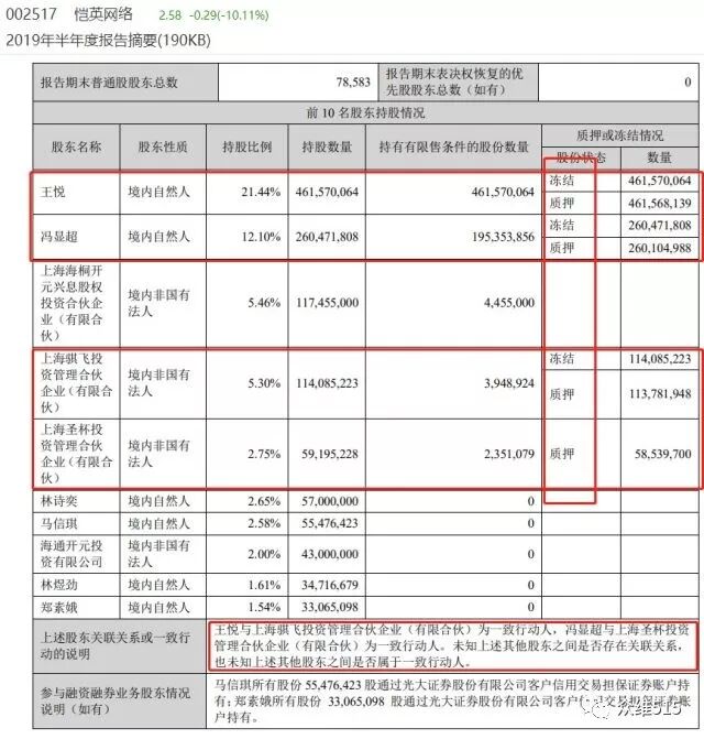 众维515还注意到,自2016年2月公司刚完成借壳上市起便发布了第一笔股权质押公告,截止目前,已连续发布60余份股东质押及解质押公告。而根据公司半年报,公司前两大股东亦都是公司创始人的王悦和冯显超及其一致行动人所持有的逾41%公司股份已近100%质押冻结——又是股权质押套现的老套路?